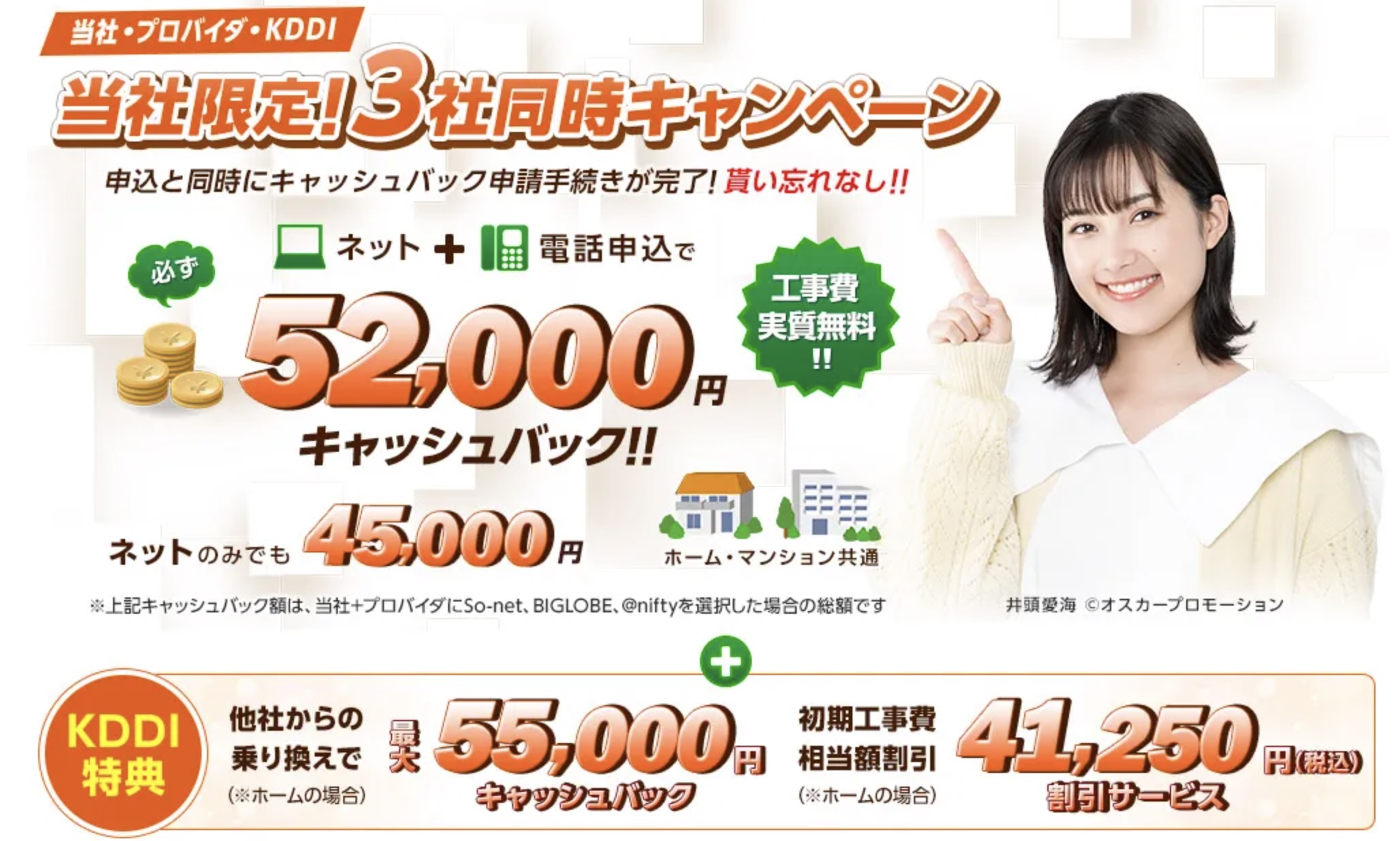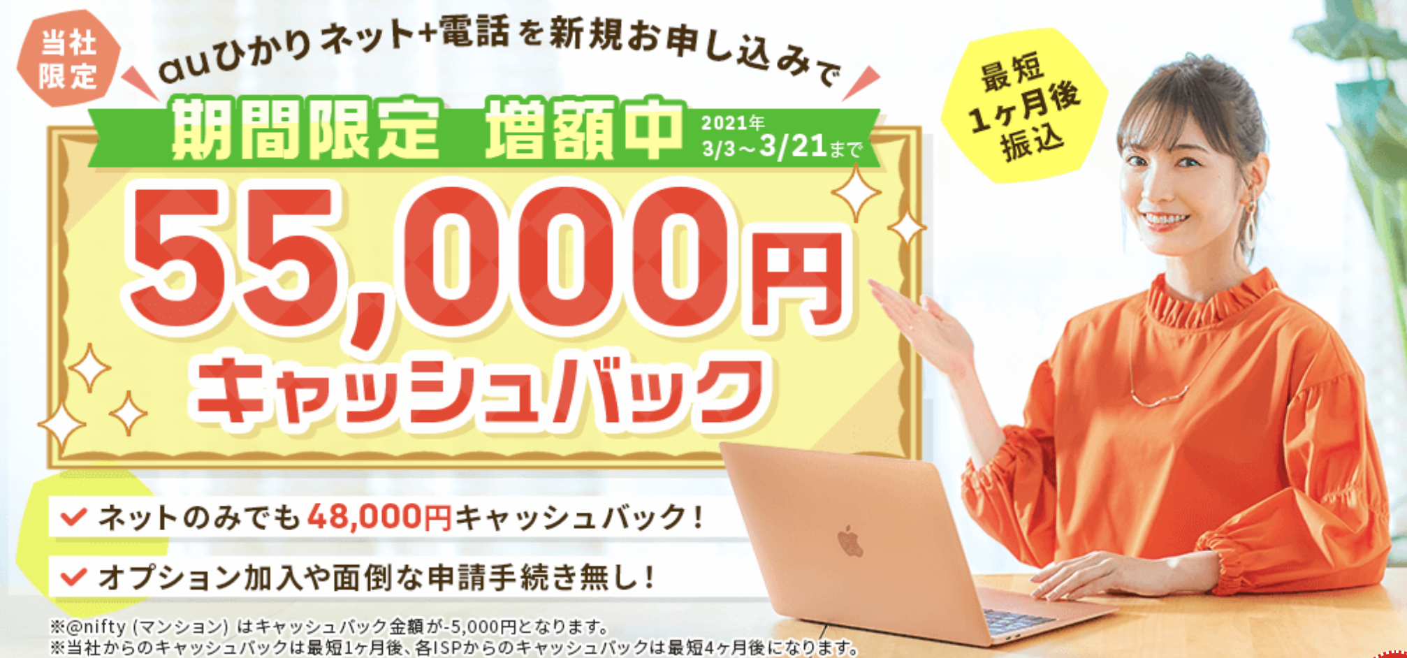 NNコミュニケーションズなら、auひかりが55,000円キャッシュバックキャンペーン