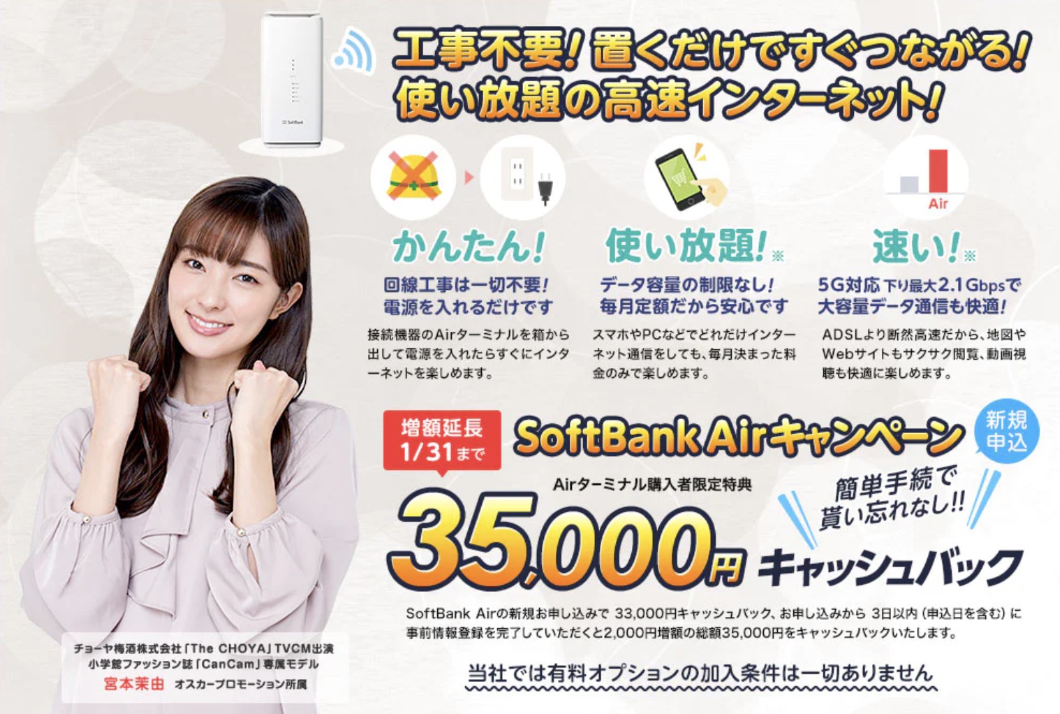 エヌズカンパニーなら、SoftBank Airが30,000円キャッシュバック