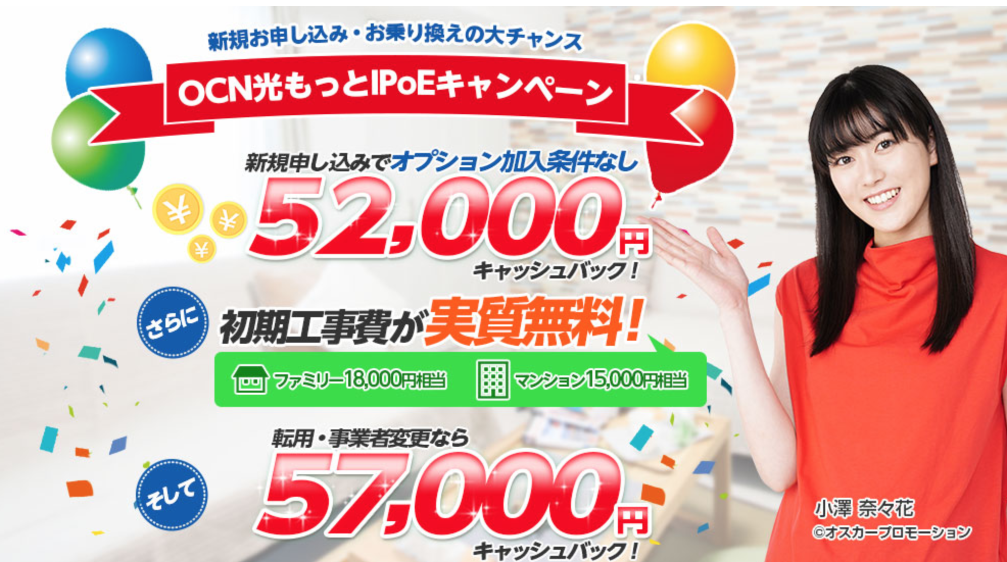 株式会社ラプターのocn光は、最大52000円キャッシュバック!